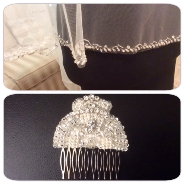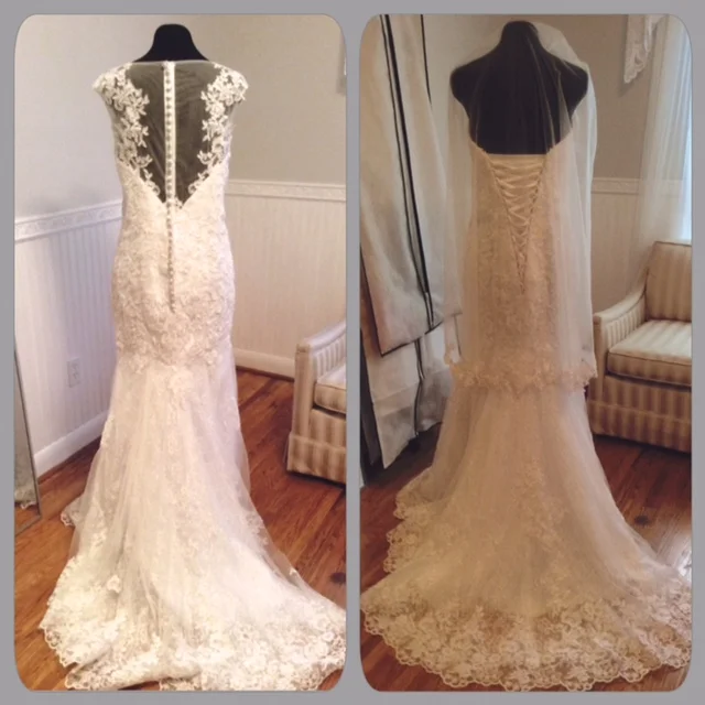 This bride wanted a strapless corset-back dress, so we removed the illusion neckline and used the extra lace to make a matching veil.