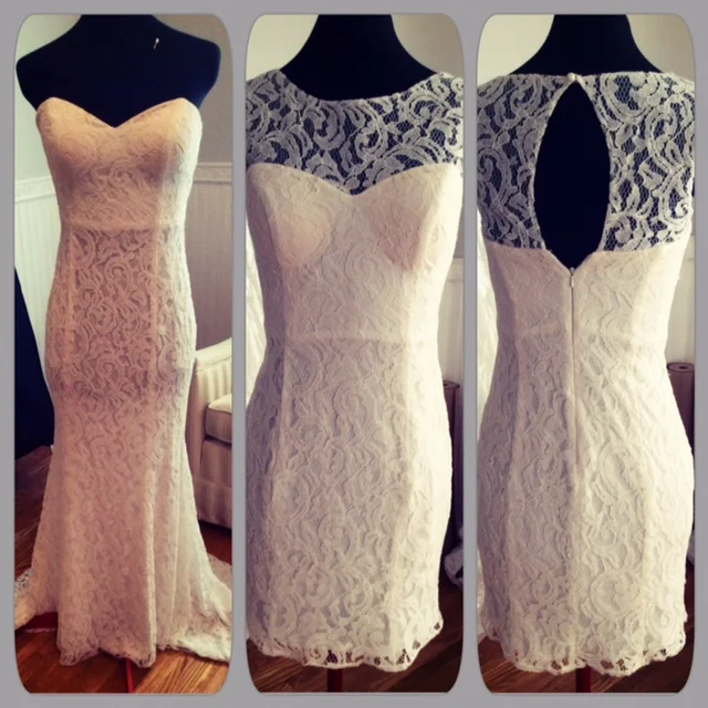 After the wedding, this woman wanted a dress she could wear again, so we shortened the skirt and used the extra fabric to make a lace neckline with keyhole back for a cute party dress.